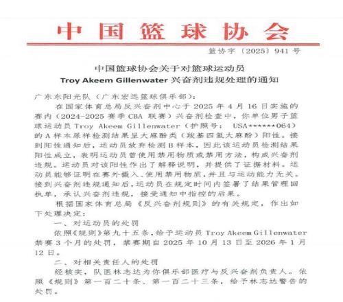 雷速体育10月13报道 根据中国篮协官方的公示,对于上个赛季效力广东队大外援吉伦沃特兴奋剂违规处理结果正式公示。