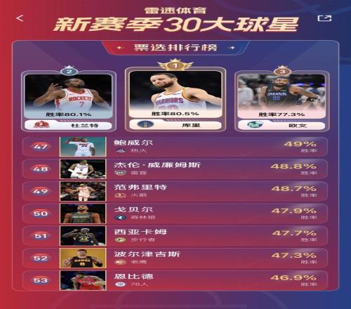 雷速NBA30大球星即时排名:库里力压KD居首,杨瀚森第9