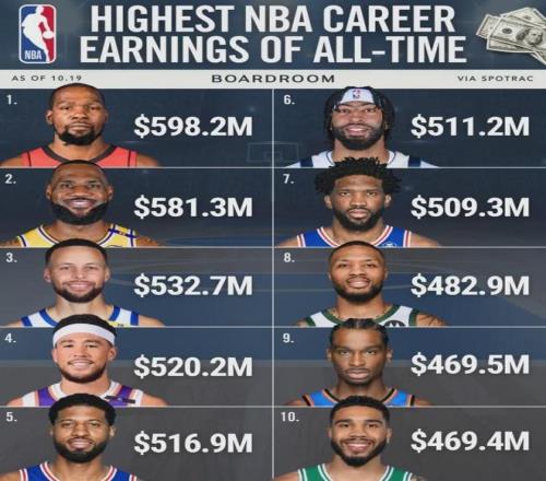 算上新的续约合同,杜兰特的职业生涯薪金总和将达到5.982亿美元,他已经超越詹姆斯(5.839亿),成为NBA历史总薪资最多的球员。