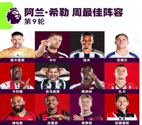 雷速体育10月28报道 英超第9轮上周末结束,阿兰·希勒评选本轮最佳11人阵容,曼联球员姆伯莫双响入选,卡什、扎卡在列。