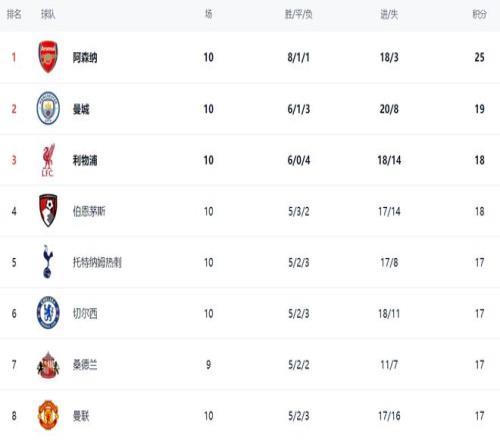 曼城赢下这场比赛之后排名升到了第2。曼城的战绩是6胜1平3负,拿到19分。而18个积分的利物浦掉到了第3名。第4的是伯恩茅斯,拿到18分。热刺、切尔西、桑德兰和曼联都是17分。曼联因为净胜球劣势,只能排名第8。曼联的排名虽然看起来很靠后,但实际上只比第2名的曼城少2分而已。