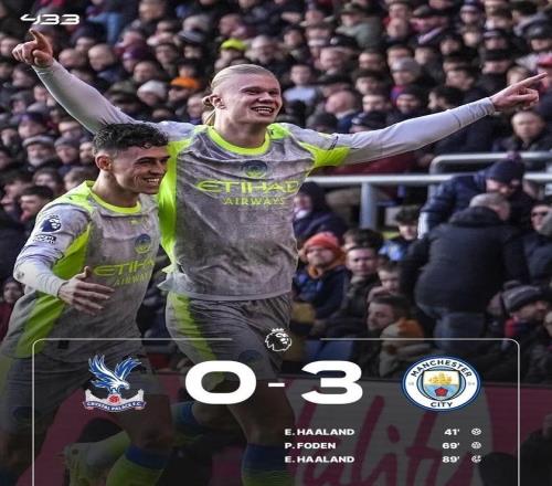 英超第16轮,曼城作客挑战水晶宫,上半场,哈兰德头槌破门。下半场,谢尔基助攻福登贴地斩建功,萨维尼奥奔袭造点,哈兰德点射再下一城。最终,曼城3-0客胜水晶宫。
