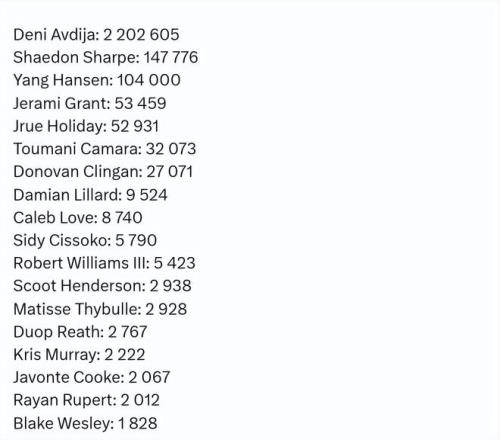 有媒体统计了开拓者球员在球迷投票环节的得票情况。阿夫迪亚2202605票断层领先全队,开拓者得票第二多的球员是谢登-夏普,他得到147776票,而杨瀚森得到104000票,位居第三。格兰特和霍勒迪分列第四和第五。以下是所有人的具体票数——