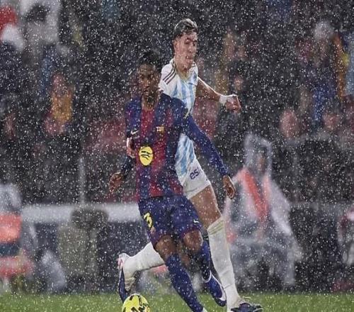 暴雨倾泻进诺坎普球场,记者纷纷在媒体席上撑起雨伞工作